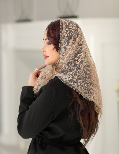 روسری سه گوش گیپور دور دانتل طرح دار کرم رنگ قواره 110
