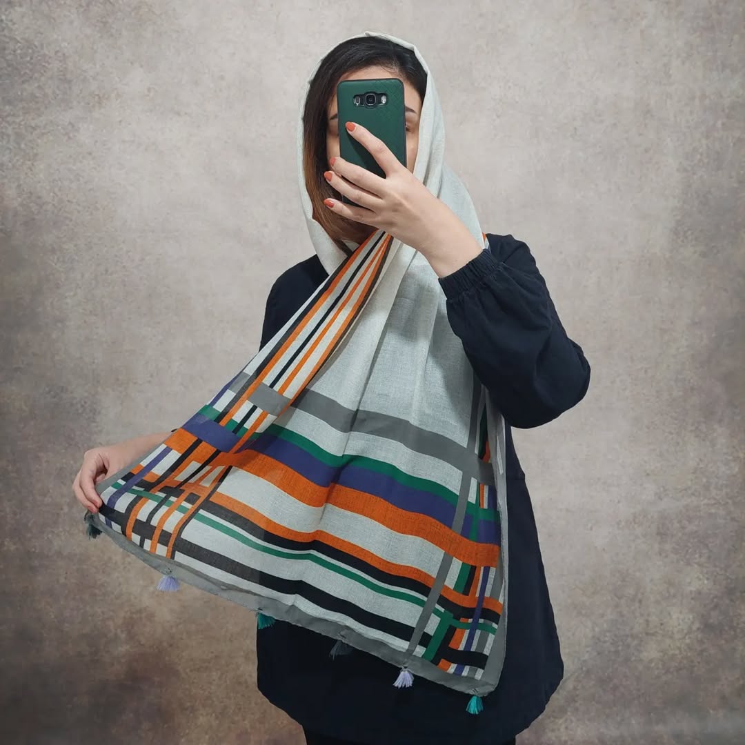 جنس نخی سبک و خنکی داره که اصلا لیز نیست، وسط کار تک رنگ سفیده، توی دستک ها راه راه های رنگی کار شده، ابعاد شال در 70 سانتیمتر با ایستایی عالی.