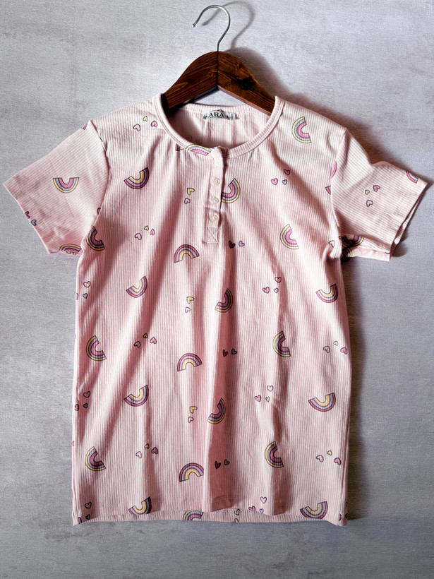 تیشرت زنانه کبریتی گلبهی رنگ با طرح رنگین کمان